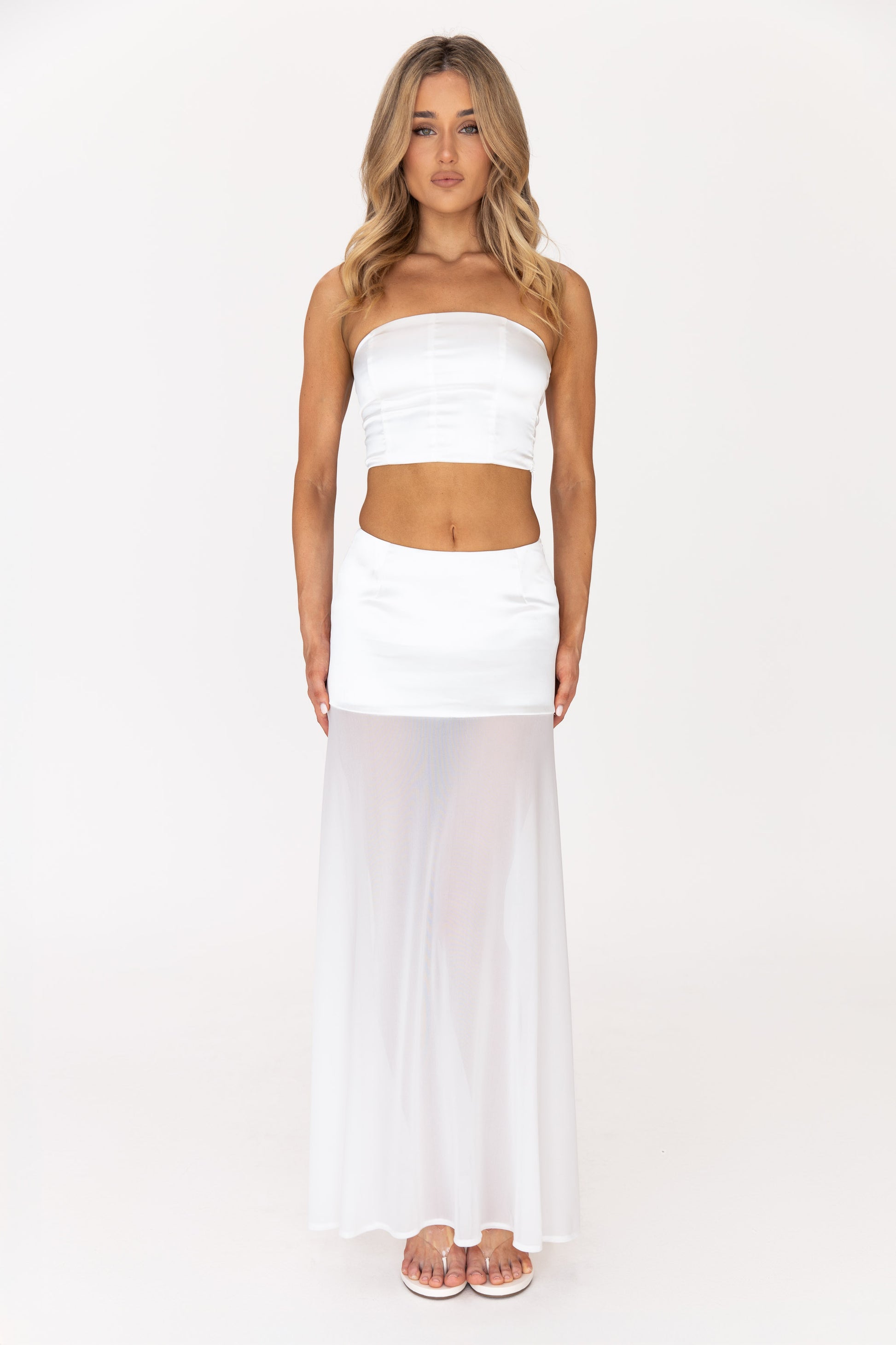 Designed to captivate, the Élanore Skirt brings a modern romance to evening dressing. Featuring a sculpted satin waistband that smooths and defines, it falls into a sheer, floor-length silhouette that moves with ethereal ease. The structured top contrasts beautifully with the soft, fluid layers beneath, creating a play of light, texture, and femininity. Pair yours with the matching Ophelia Top for a look that’s effortlessly polished and unforgettable.